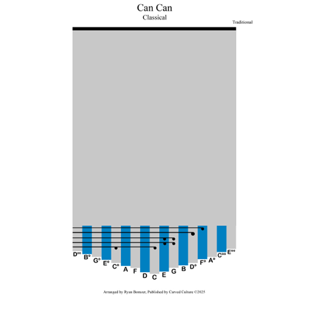 © Carved Culture. All rights reserved. This digital sheet music of Can Can is based on a public domain melody. By purchasing this sheet music, you are granted a license for personal, educational, or non-commercial use only. Redistribution or commercial use of the sheet music is prohibited. All artwork and presentation of the sheet music are the property of Carved Culture.
