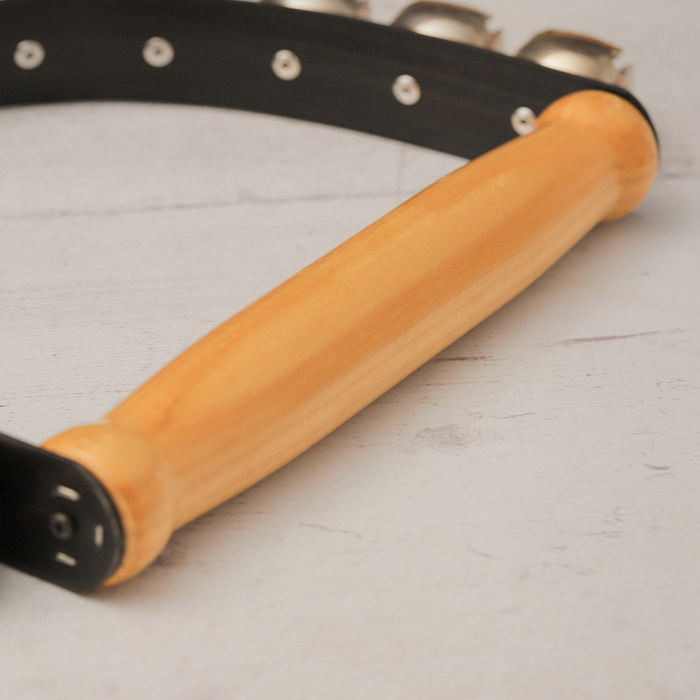 The Sleigh Bell Shaker has a solid smooth wood handle with an attached leather strap with attached stainless steel jingle bells. When shaken the percussion instrument produces a classic jingling sound that is similar to what can be heard in almost every Christmas themed song. This seasonal Sleigh Bell Shaker is a professional musical instrument and is not considered a toy and so should be used with adult supervision. The handle is comfortable to hold and the instrument is great for recording in the studio.