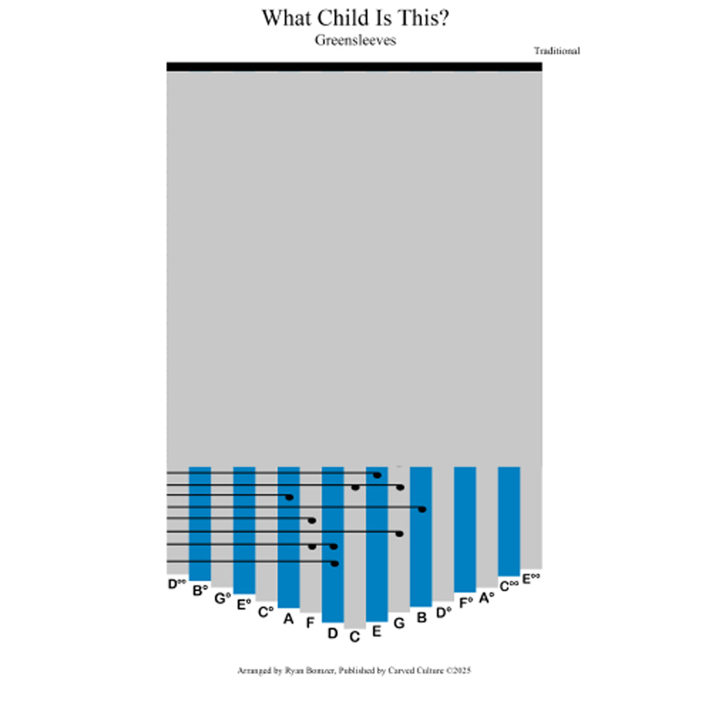 © Carved Culture. All rights reserved. This digital sheet music of What Child Is This is based on a public domain melody. By purchasing this sheet music, you are granted a license for personal, educational, or non-commercial use only. Redistribution or commercial use of the sheet music is prohibited. All artwork and presentation of the sheet music are the property of Carved Culture.